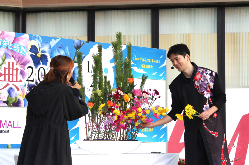 宮崎県産の美しい花(県産花き)の消費拡大やPRを目的としたイベント『みやざき花の祭典2026』(主催:「みやざき花で彩る未来」推進協議会)が1月31日(土)・2月1日(日)にイオンモール宮崎(宮崎市)で開催され、2月1日にIKENOBOYSの馬場健がいけばなパフォーマンスを行いました。